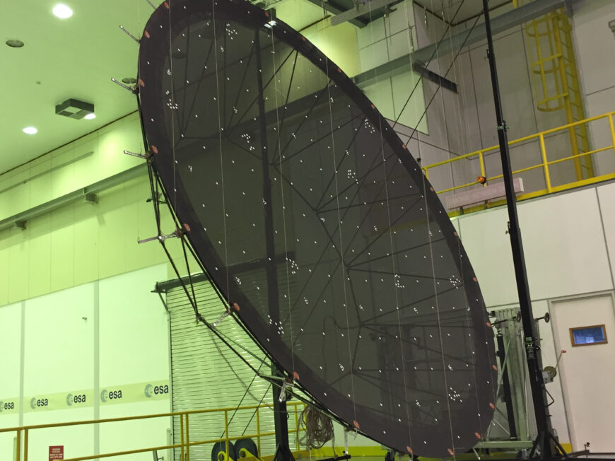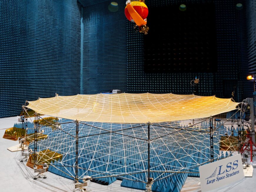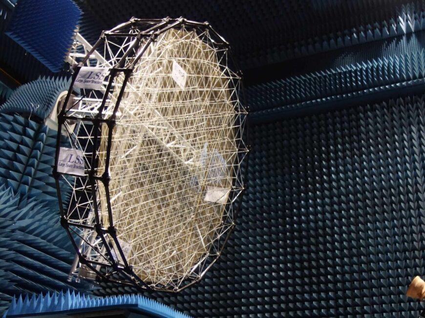 This news posting is written by esa.int A whole new kind of large space antenna has been tested in realistic space conditions. This 5 m-diameter reflector seen being lowered into ESA’s Large Space Simulator appears translucent because it is a few tenths of a mm thick – thinner than a piece of card. “This marked…