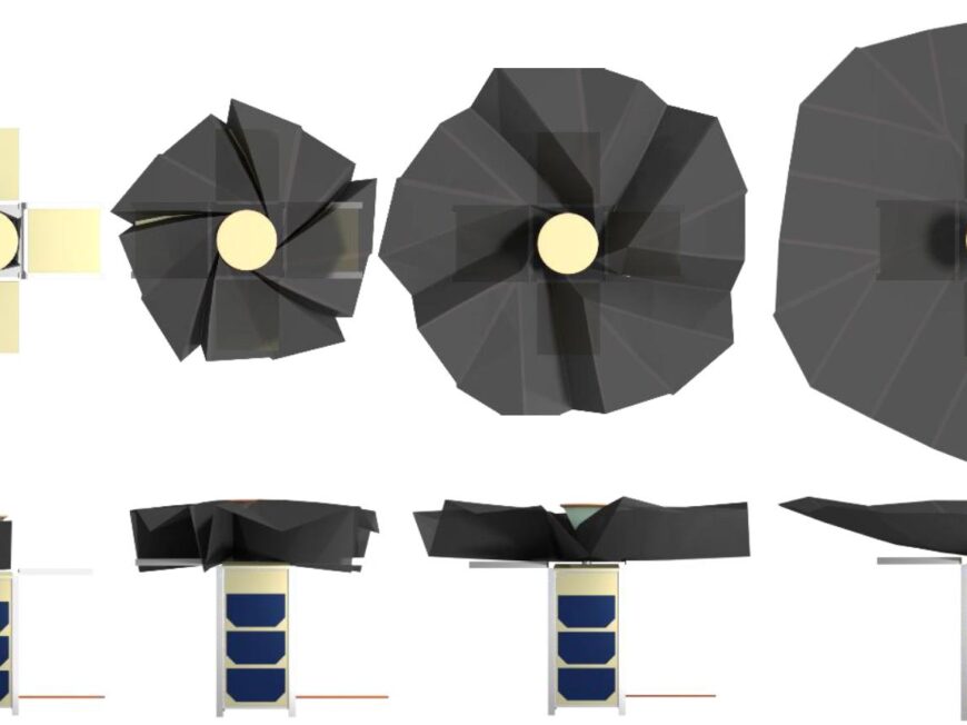 A deployable CubeSat antenna using origami techniques was tested at Thales Alenia Space facilities in Toulouse, France. Operating at 30 GHz (Ka-band), the 41dB antenna is exceptionally small and light, weighting only 600 g and folding into a cylinder of 100 mm diameter and 130 mm in height, while preserving outstanding RF performance. This is…